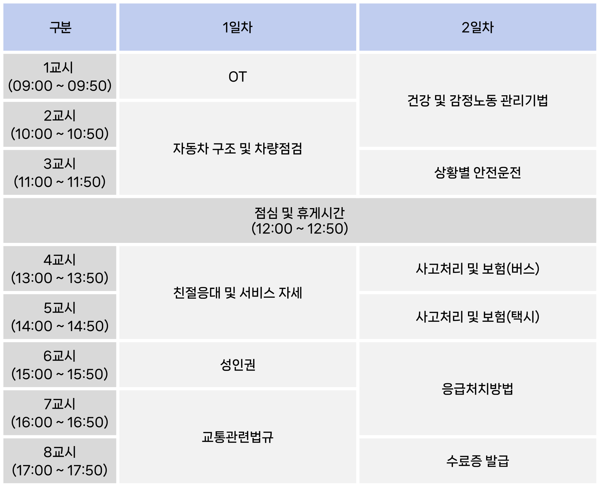 ☑ 신규교육 시간표※ 과목 강사 및 배정시간 등은 변동될 수 있음